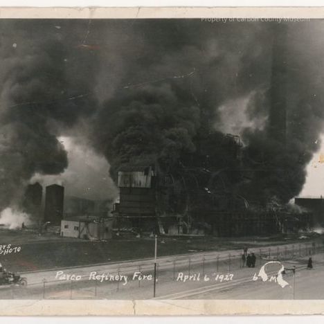 Update March 2011: Black & white print of large plumes of black smoke rising from tanks & buildings. In distance is an uneven level building. In the left foreground is a firetruck. A fence separates refinery ground from street & a few people stand by the fence. Printed in white on bottom: "Meyers Photo" "Parco Refinery Fire April 6, 1927 6 A M"