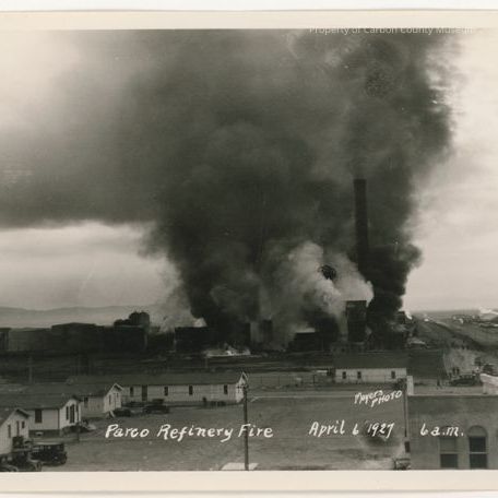 Update March 2011: Black & white print of dark & light colored smoke rising from buildings, a large smokestack is amid the smoke. In the foreground are small, light colored buildings on photo left. On photo right are railroad tracks & a road that parallels each other. In the distance on photo right are larger buildings with steam rising in two places. A stucco building is in foreground right with arches at the top of the windows. Printed in white areas across bottom: "Parco Refinery Fire April 6, 1926 6 A.M. Meyers Photo"