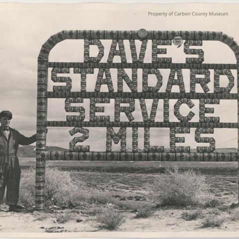 Update - 2009: Black & white print. Snapshot. Image of a man dressed in coveralls & a cap standing with his left hand on the left of a large sign made from motor oil cans. Sign has been erected on the sagebrush prairie. Exterior frame of sign made from Penzoil cans; message constructed out of Quaker State cans. Sign reads: "Dave's Standard Service 2 miles".