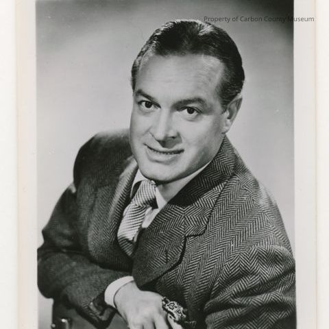 Update 2009: Black and white print, image of a man. He is wearing a suite coat with design, white shirt with striped tie. Right arm is lying across chair back with hand under. Hanky in jacket pocket. (Bob Hope).