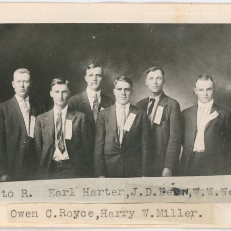 Black and white print of 6 men. They are standing in two rows, two in the front and 4 behind. they are all wearing dark suits, white shirts and print ties and have a ribbon or tag attached to their left lapel. Typed on paper attached to bottom: " L to R Earl Harter, JD Kern, W.W. Weaver, Owen C. Royce, Harry W. Miller."