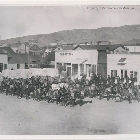 Update - March 2010: Black & white print & one copy of early day Rawlins' Front Street. Image of covered wagons with mule teams harnessed to them. There are three rows of wagons that have printed on them: "Wyoming Transportation CO". Teams are at least 12 mules. A line of men is standing on boardwalk behind teams. Business signs on buildings: "Photographs" "The Capitol" "The BonTon" "Saloon" In the distance are other buildings, signs include: "Hardware" "J E Osborne Chemist" "Rawlins Drug Store"