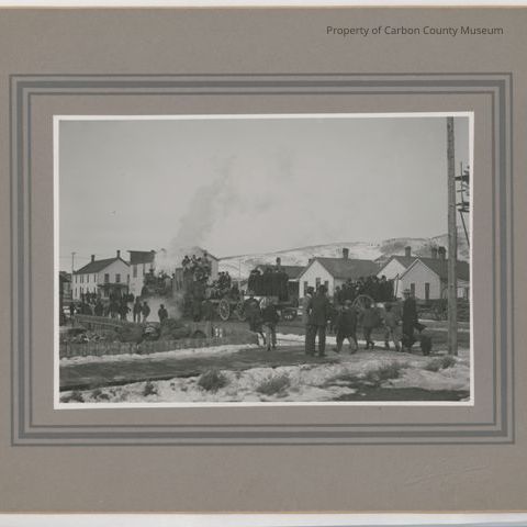 First National Bank lot where the bank was later built at this time it belonged to Jim Clouse and was used to store or throw beer barrels. He had a saloon at that time. Rawlins Fire Dept. shown going to a fire. Time about or between 1898 and 1905.
