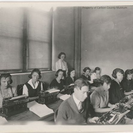 Update 2/2010: Black and white print on high school age typing class. There is one boy and 10 girls seated at two long tables in two rows each with typewriters in front of them. They are all loaded with paper and an open vertical book is on the table between the typewriters. A young woman is standing at the near corner of back wall. The shades on the two windows are closed. A white #464 in lower right corner from negative. Written on back in blue ink : " Found in old Central School building (built 1886) when it was closed as a school in 1959." Brought to museum by Robert Sullens." Written on back in pencil: "Mellie Murphy, Besse Lambertson, Bonita Hanson, Bess Bowlus, teacher."
