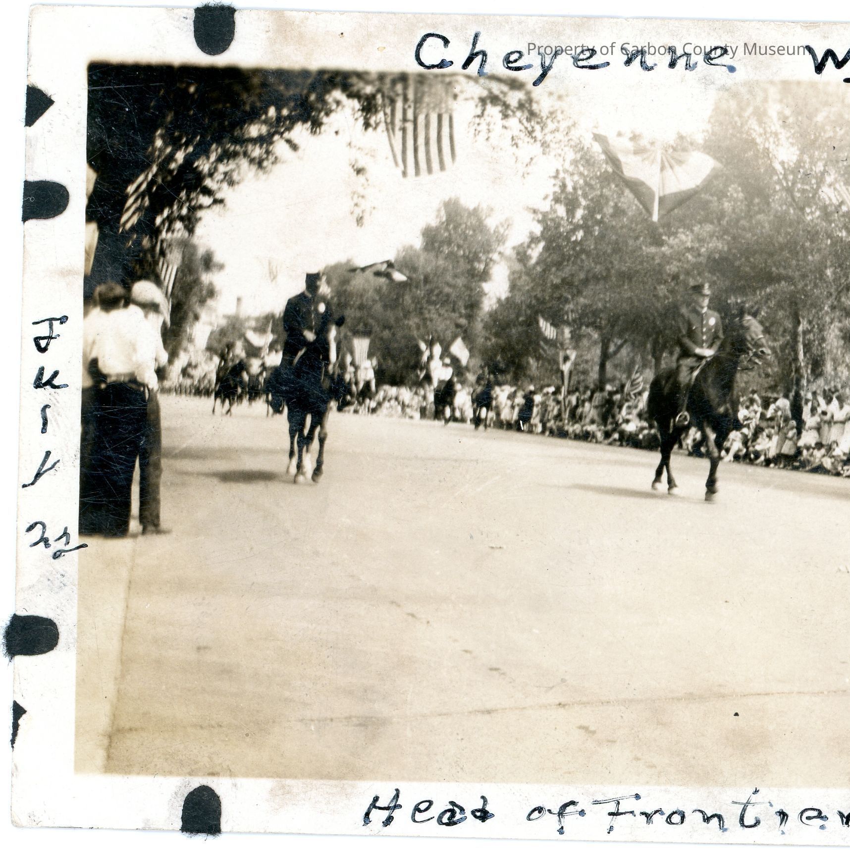 Sepia tone photograph. A crowd is gathered on either side of a street as three men in four men in uniforms ride horses. Written along the top edge of the photograph is "Cheyenne Wyo.", along the bottom "Head of Frontier Parade", vertically along the left "JULY 22", vertically along the right "1931". The number 2 is printed on the reverse.Collection