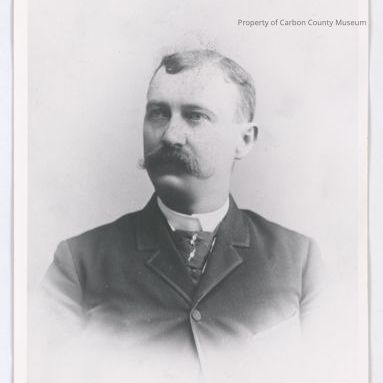 Update - September 2010: Black & white copy print. Image of a man wearing a dark jacket with piping trim on his lapel & collar & top button is buttoned. He has a dark tie & white stiff collar shirt. He is facing toward photo left & has a large mustache. His hair is parted on his left.