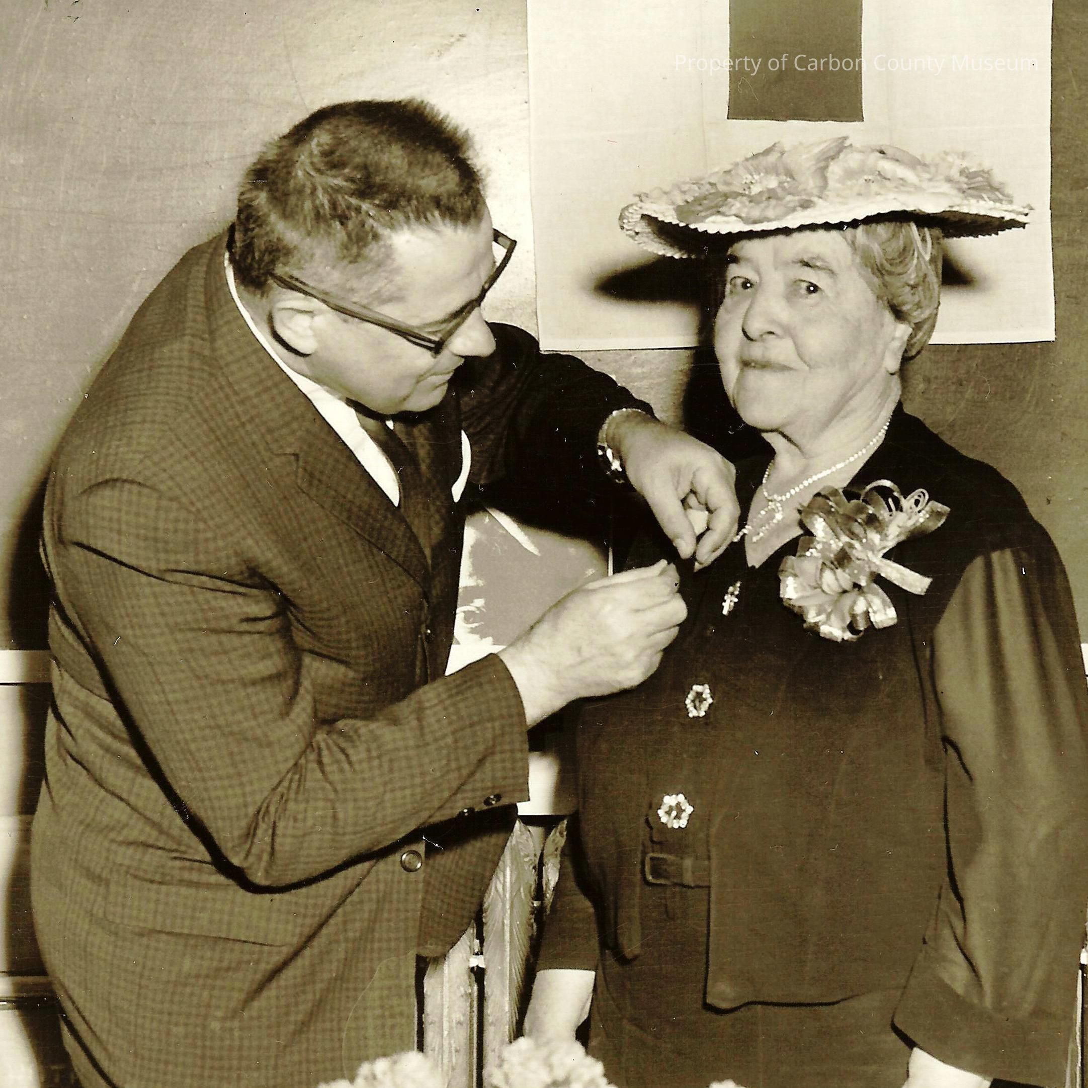Photo was run as a mystery photo and had three responses to the mystery photo. The woman on the right has been identified as Mrs. Belle Ryan Welch, (1883-1965). The man on the left might possibly be George Koroulis. Belle was the daughter of Mr. and Mrs. Con Ryan, who came to Rawlins in 1884 when Belle was one year old. According to her obituary, she was a well-known Rawlins humanitarian. She was active in many organizations, and was a charter member of the American Red Cross which was organized in Rawlins in 1918. She volunteered more that 47 years of service to that group. She was one of four organizers of the American Cancer Society in Wyoming and was Carbon County Unit President at the time of her death.