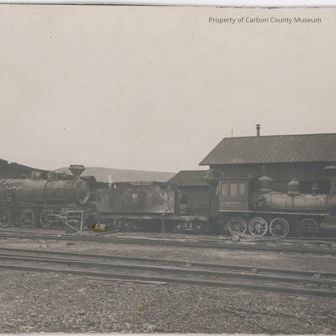 Written on back: [blue ink] "3-e Old [marked out with pencil] engines- in front of old [marked out with pencil] U.P. depot which was located on south side of tracks." [black ink] "Copied by State" "Mounted" [red pencil] "Page 11- pix 2 - 3 5/8 x 7 1/4" [pencil] "-88%" "5282" [pencil on white adhesive label] "Locomotives"