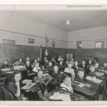 Update - March 2010: Black & white print. Image is of a school class showing the children seated at their wooden desks & looking back over their right shoulder at the camera. A woman wearing a dark dress with a lace collar is standing at far side left by a blackboard which encircles the lower walls around the visible portion of the room. A globe is suspended from the ceiling in distance. A tiny white number 457 is at side right corner from negative process. Many of the children have books & Big Jo writing tables on their desks.