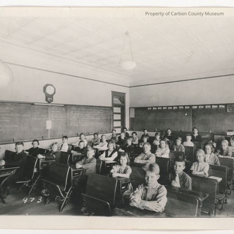 Update - Mar 2010: A black & white print of a classroom with five rows of boys & girls seated at their wooden desks & posed looking at the camera with their hands & arms resting on the desk tops. A world globe is swinging from ceiling at top left. Blackboards are attached to the walls encircling the room. a multicolored door is at left rear. A tiny white #473 is at lower left corner.