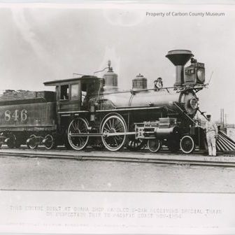 One 6 1/8 x 9 1/8" scanned black & white print. Caption at bottom edge: "Engine built in Omaha, handled 5-car receivers special train on inspection trip to coast - Nov 1894. Courtesy of Carbon County Museum. All Rights Reserved."Collection