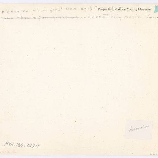 Written on back: [pencil] "5" "old engine which first ran on UP in 1868" "[next phrase crossed out came thru a few years ago-" "advertising movie "Union Pacific"' [blue ink] "3-h" [red pencil] "Page 8 - pix 2" [pencil on white adhesive label] "locomotives" 'pencil" 5264".
