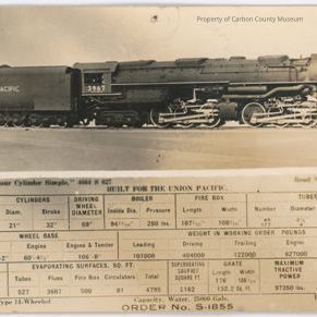 Sepia print. Printed on postcard paper. Advertising card for a Union Pacific locomotive engine. Image at top of a coal fired steam locomotive engine & tender. Below is a chart of the specifications of this engine - "four cylinder simple" "Road Number 3967" "Order No. S-1855".