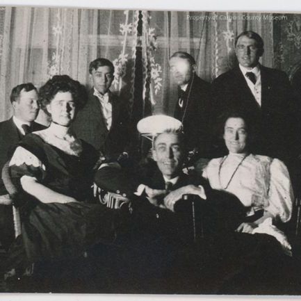 Update - June 2010: Black & white print. Snapshot. Image of seven people posed in front of a large window covered by a sheer curtain. Patterned wallpaper on walls in background. Five men in suits with two women (one in light colored dress; one in dark dress with light accents) are gathered around. A small table with a lamp (barely visible) at center. Light splash over face of second man from right in back row.