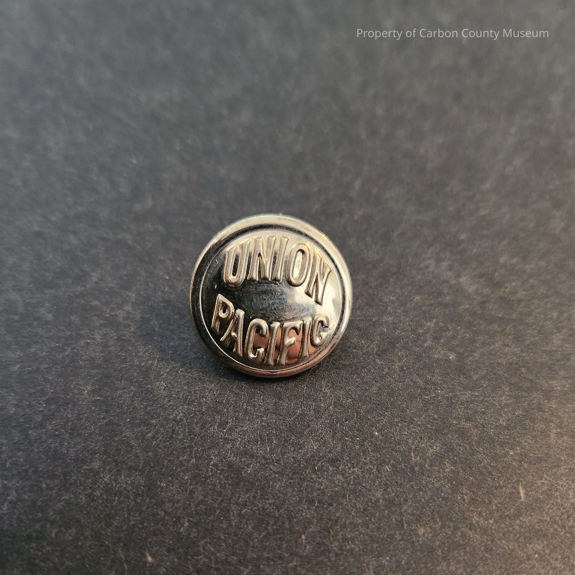 A metal button, likely tin, with the words "UNION PACIFIC" embossed on the face, on the reverse the words "SUPERIOR QUALITY" are etched into it.