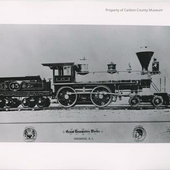 Black & white copy print. Snapshot. Image of a steam locomotive engine & tender. Number 45 painted on side of tender. Image dark. Printing in lower margin of original print: "[Medallion-Gold Medal] "Grant Locomotive Works" "Paterson, N.J." [medallion-awarded Paris]" Unclear script at each end.