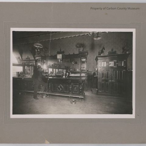 Update - 2009: Black & white print attached to gray matboard. Image is of a man standing at a wooden covered bar in a saloon with his left foot propped on a foot rail with a large glass of beer? in his left hand resting on bar counter. A bartender with a striped shirt & dark vest has a drink in his hand with his back to the mirrored bar. Mirrored backbar behind serving bar with glassed in cupboards on each end containing liquor; glasses stacked on shelf under mirror. Large cupboard on ice box at right. Wood floor; dark splotches on floor in front of men. Mirror on left wall. Sign on back bar: "Drink 15 c 2 for 25 c". There are two metal spittoons on the floor by the foot rail.