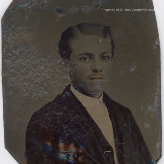 Tintype. Studio pose. Head & shoulders portrait of a young man in a dark suit & light shirt - no tie. Slight mustache; hair parted on right.