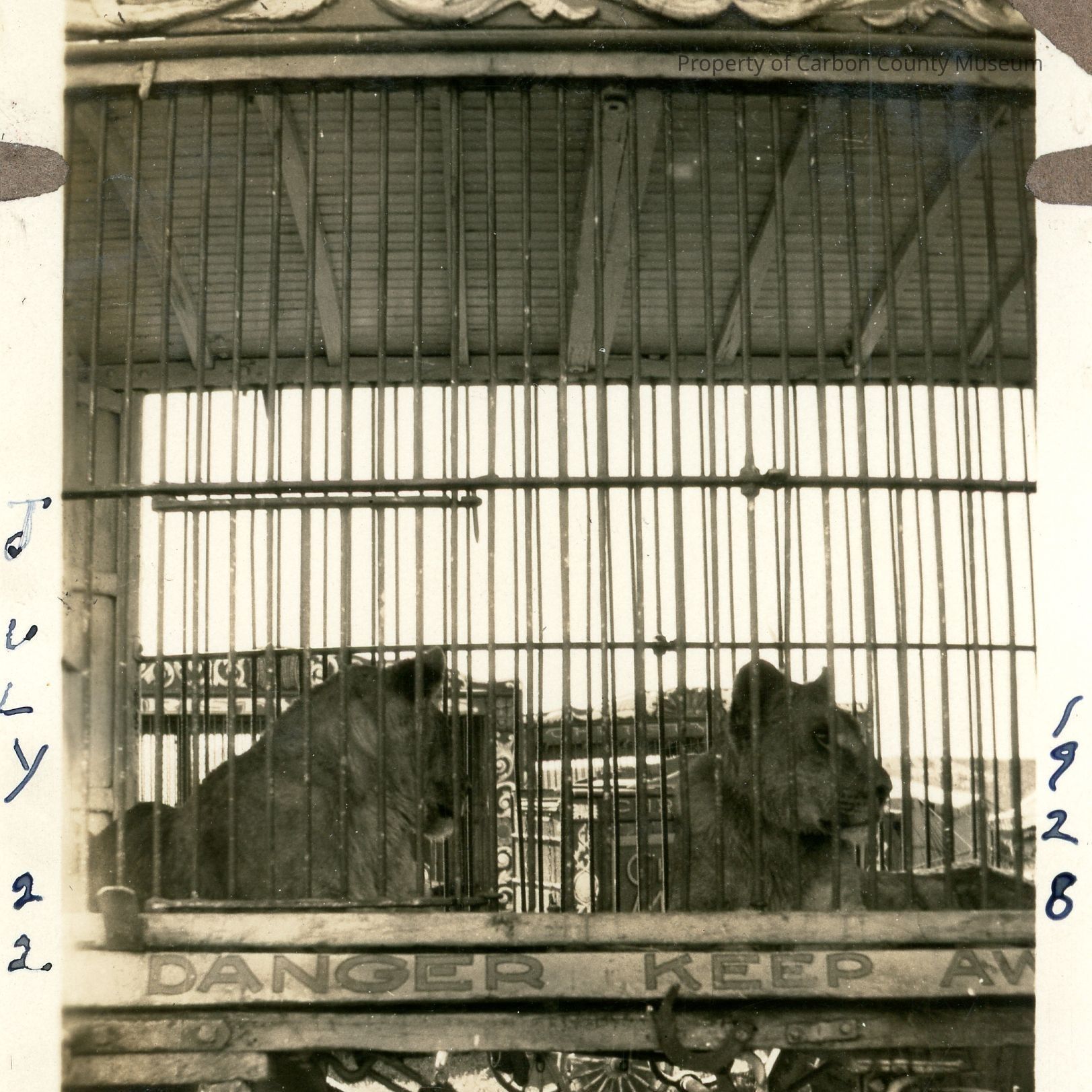 Black and white photograph. Two female lions are in a cage on wheels, text below the animals reads "DANGER KEEP AW-" the rest is out of frame. Written along the top edge of the photograph is "RAWLINS", along the bottom edge is "LIONS", vertically along the left "JULY 22", vertically along the right "1928". Printed on the reverse is the number 28, also present is a circular green stamp that reads "MEYERS PHOTOS PHOTO FINISHING RAWLINS, WYO".Collection