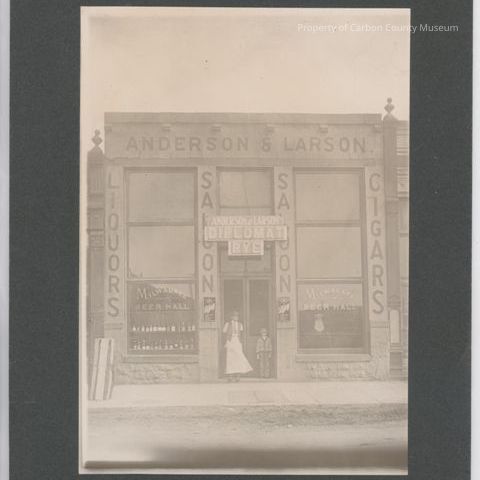 Update - 2009: Black & white print attached to black matboard. Image shows a store front with a man dressed in trousers, shirt, vest, hat & long white apron & a young boy all standing in the doorway. "Anderson & Larson" are painted across the top of the building from beneath the top cornice area. Vertical painted words extend down front areas of building on either side of doorway & windows. They include: Liquors, Saloon, Saloon & Cigars. Lower half of tall windows have painted sign on windows: Milwaukee Beer Hall on each side of the door. Window side left has bottles of liquor on two shelves seen through the glass. Bottom edge of building is sandstone blocks. Sidewalk is wooden planks & roadway in foreground is dirt.