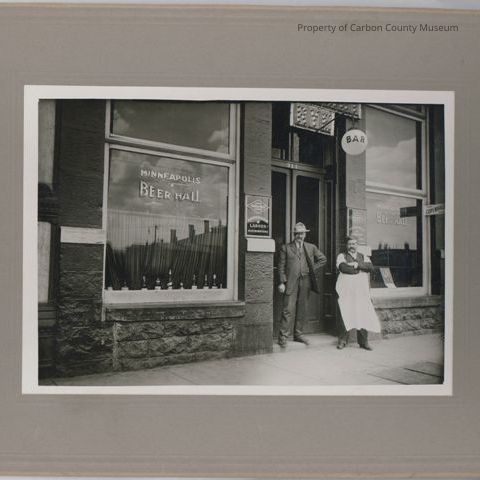 Update - 2009: Print 1: Black & white print attached to gray matboard which has engraved border. Image shows a saloon with two men standing by doorway. Man on left is dressed in three piece suit & high dormer hat. Man on right is wearing dark trousers, white shirt, dark vest, dark sleeve protectors & a long white apron. He has his arms crossed at chest level. Lower edge of building is sandstone blocks. There are very large two panel windows on each side of the doorway. Both windows have white lettering that reads: Minneapolis Beer Hall. Bottles of liquor are lined along left window edge with half curtain hanging behind them. Small framed signs on each narrow wall of building to left front at door reads: Golden Grain Belt Beers Anderson & Larson Distributors. A globe light hangs from a black curved rod over the doorway with the word BAR printed on it. A wooden plank sidewalk is in front of the building. Not on back of matboard writhen in black ink: 313 North Front about 1910 was Milwaukee Beer Hall of Anderson & Larson - 1910