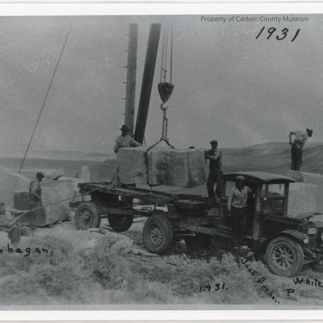 Black & white copy print. Image of a desert area in the background & sagebrush in the foreground. A vintage flatbed truck is at foreground with a large rectangular boulder in the process of being loaded in the truck by a large pulley which is suspended above & connected to two large timbers anchored with a cable at side left. Two men are in the truck bed with one on each end guiding the boulder into place. A man is standing at the open right truck door, with other men at various areas in the process of working on the boulder's or receiving the load on the truckbed.