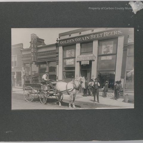 Update 2009: Black and white print attached to black mat. Image of businesses on 300 block of Front St. Sign above store reads: "Golden Grain Belt Beers". Other signs on front: "Anderson & Larson Diplomat Rye." In a window: "Buffalo Bills Wild West Pawnee Bills Rawlins Saturday July 26". Building to photo left is Tivoli Bar. Sign on store is vertical hanging: "TIVOLI". A wagon sits on street in front of buildings, a man is on seat holding reins of light colored horse. Six men stand on walk in front of window with painted sign reading: "Minneapolis Beer Hall". Building to photo right sign only partially visible reads: "Milwaukee Beer". Paper taped to back reads: "300 block Front St. Rawlins July 1913 Buffalo Bill Pawnee Bill advertizing, car arrived in town July 4. Show was to take place July 26. Show never took place as it was attached and detained in Denver. Prepaid ticket holders lost their money. Minneapolis Beer Hall 313 W. Front. Anderson & Larson Props. Tivoli Bar 315 W. Front, Pete Johnson prop. Milwaukee Beer Hall 311 W. Front:".