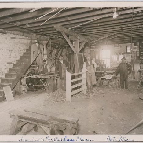 Black & white print attached to grey matboard. Image shows a basement workroom with various woodworking tools & equipment. Three men are wearing heavy aprons over their workclothes standing in the middle of the room next to objects. A fourth man on left is standing next to a two-wheeled boiler ? under the stairway well. A man next to a non-electric table saw. Man at middle is leaning on a newly completed 4-shelf bookcase. A man on the right is resting his right hand on a saw horse with two planks laid across the top. Room has a dirt floor, window with sunlight beaming in at back of room, other workbenches, & a large pot belly stove on right. Two rough saw horses are in foreground. Written on lower edge of print in blue ink: James Irving, Chris Black, H. Larsen, Marten Petersen 1908-1909.