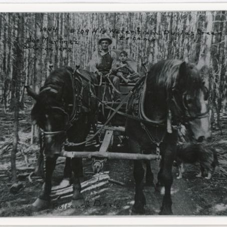 Black & white copy print. Image shows two large horses hitched & pulling a wagon with a man & small boy in the driver's seat with the man holding the reins. They are riding on a narrow dirt road through an Aspen Grove. A dog is at the right.