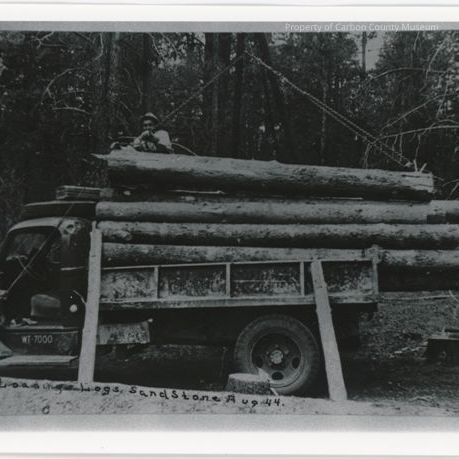Black & white copy print. Image shows an older flatbed truck with it's cab door open. Bed of truck is heavily laden with long cut logs. A long chain pulley at top is being guided by a man at the top of the load of logs. Written on lower edge from negative process: Load of logs. Sandstone 1944.
