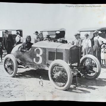 Update - June 2010: Black & white print. Snapshot. Image of a vintage race car with a large white "3" painted on the side. Two men seated inside small driver/passenger compartment; both are wearing leather helmets with goggles pushed up on top of their heads. Spectators standing behind with three vintage automobiles in background.