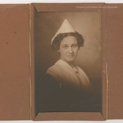 Update - May 2010: Sepia print. Studio pose. Head & shoulders portrait of a woman. She is wearing a white bodice with a brooch at the center necklace. She has on a pointed white cap & her hair is either pinned up or cut short.