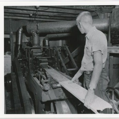 Black & white copy print. Image shows a light haired man feeding a plank into a machine with rollers. Large round pipes are at ceiling & they feed into a vertical object at rear of machine & into duct work at side right. large belts are attached to wheels at side left. Room is unfinished.