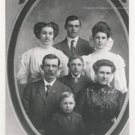 One partially visible original mat had dark oval frame with ribbon at top.Oval half length portrait of a group of seven people posed in front of a painted backdrop. Two young boys at front and center dressed in dark suits. Man in dark suit seated in second row left. Woman in dark dress seated in second row right . Two young women standing in fourth row-both are wearing white dresses and have their hair pinned up. Young man in a dark suit standing in center back.