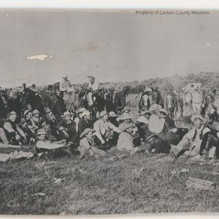 Update - 2009: Black & white print on matboard of large group of men sitting beside freight wagon with saddled horses standing behind them. Two men are on horses & two more on wagon.