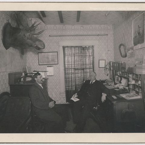 Black & white print attached to grey matboard with ivory back. Image shows a Victorian era office with patterned wallpaper on ceiling & walls. A large moosehead is hanging on side left wall. There area various paper prints, calendars, framed prints hung on the walls. Far window has sheer dark curtain. A large desk with many small cubicles is side right with papers, magazines & books located on the desk at various places. A man wearing a dark three piece suit is seated in a chair with his left arm resting on the desk & has an open card in his right hand. Another man is seated in a chair facing the man from right side. He is wearing a dark suit & holding his hands in his lap. A fainting couch is at side left.