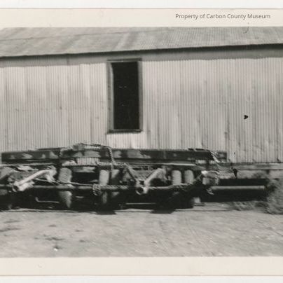 Update 3/2010: Black and white print. Snapshot. Image of a corrigated metal building loaded onto a multi-wheeled flatbed. Window in center of visible wall.