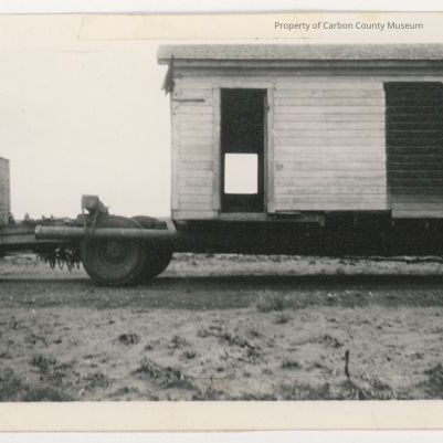 Update - March 2010: Black & white print. Snapshot. Image of a small frame building on a flatbed trailer being pulled by a vintage truck. Two doors in building on near side - one has been sealed with wood slats, other wide open. Window on opposite wall in line with open door.