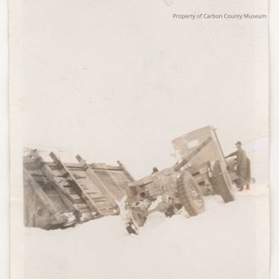 Update - March 2010: black & white print. Snapshot. Image of a vintage truck with an overturned load(?) in deep snow. wood & metal container(?) at left. Men at front of truck.