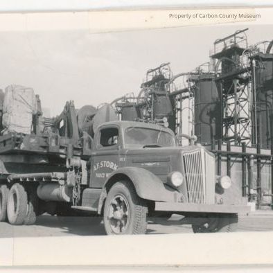 Black and white print. Snapshot. Image of a vintage flatbed truck loaded with heavy duty machine parts. Truck parked in front of a complex of cylinders, scaffolds, tubes and catwalks. Painted on side of truck: "A.F. Stork Parco Wyo."