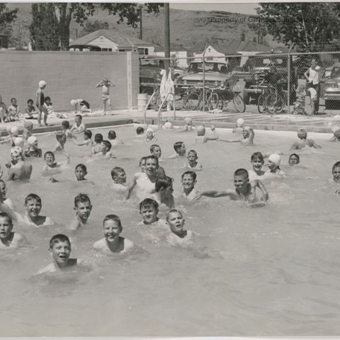 Black & white snapshot. Image shows a group of children in an outdoor swimming pool. A wall fence is at left & a chain link fence is at side right where people are standing watching the swimmers. Cars are parked near this fence & houses are in the background.