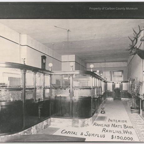 Black & white copy print. Image shows the interior of a bank building with multidimensional cabinetry & wire cages with doorway glass domes placed along top edges of top rail. The right wall has a mounted elk & a small moose head hanging mid wall. A display case is placed at mid level side right above dark mainscot. Seen about are large green potted plants & spittoon. A rear office area with door closed is seen at far wall. Printed on image from negative process: Interior Rawlins Natl Bank Rawlins, Wyo Capital & Surplus $150,000.