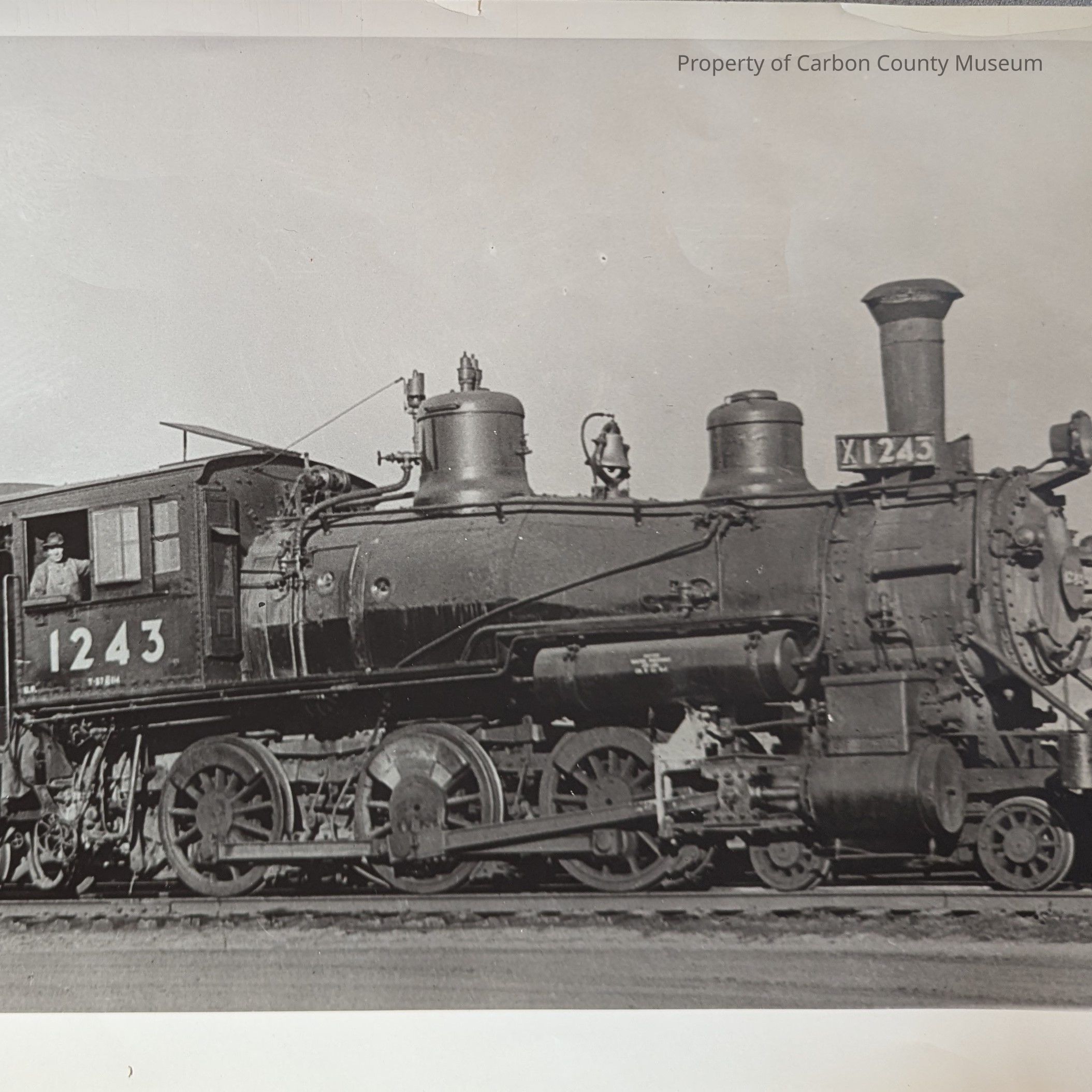 Update 3/2010: Black and white print. Snapshot. Image of a steam locomotive engine and tender filled with coal stopped in a railyard. Hills in background. Painted on side of tender: "Union Pacific". Painted on side of engine cab: "1243". Engineer in cab looking out window.