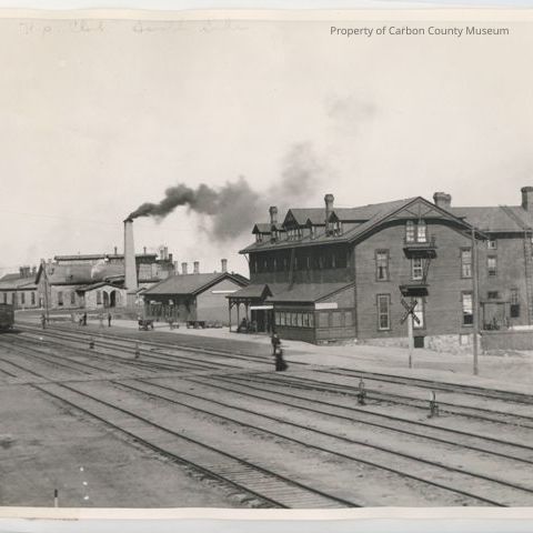 Update 3/2010: Black and white print. Snapshot. Image of a railyard with buildings on the far side of tracks. Building at right is a multi-story frame structure; sign on front "Lunch Counter". Second building is a single story frame structure with four chimneys along roof peak. At far end is a cluster of stone buildings with a tall smokestack.