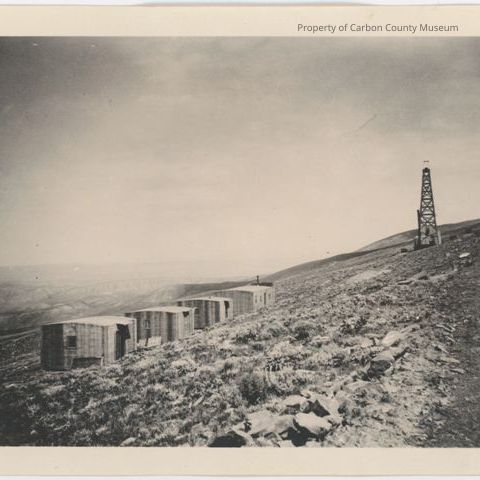 View 1 shows a wood oil derrick in distance side right with four small structures at side left. Area is rocky & barren with hills in far distance.