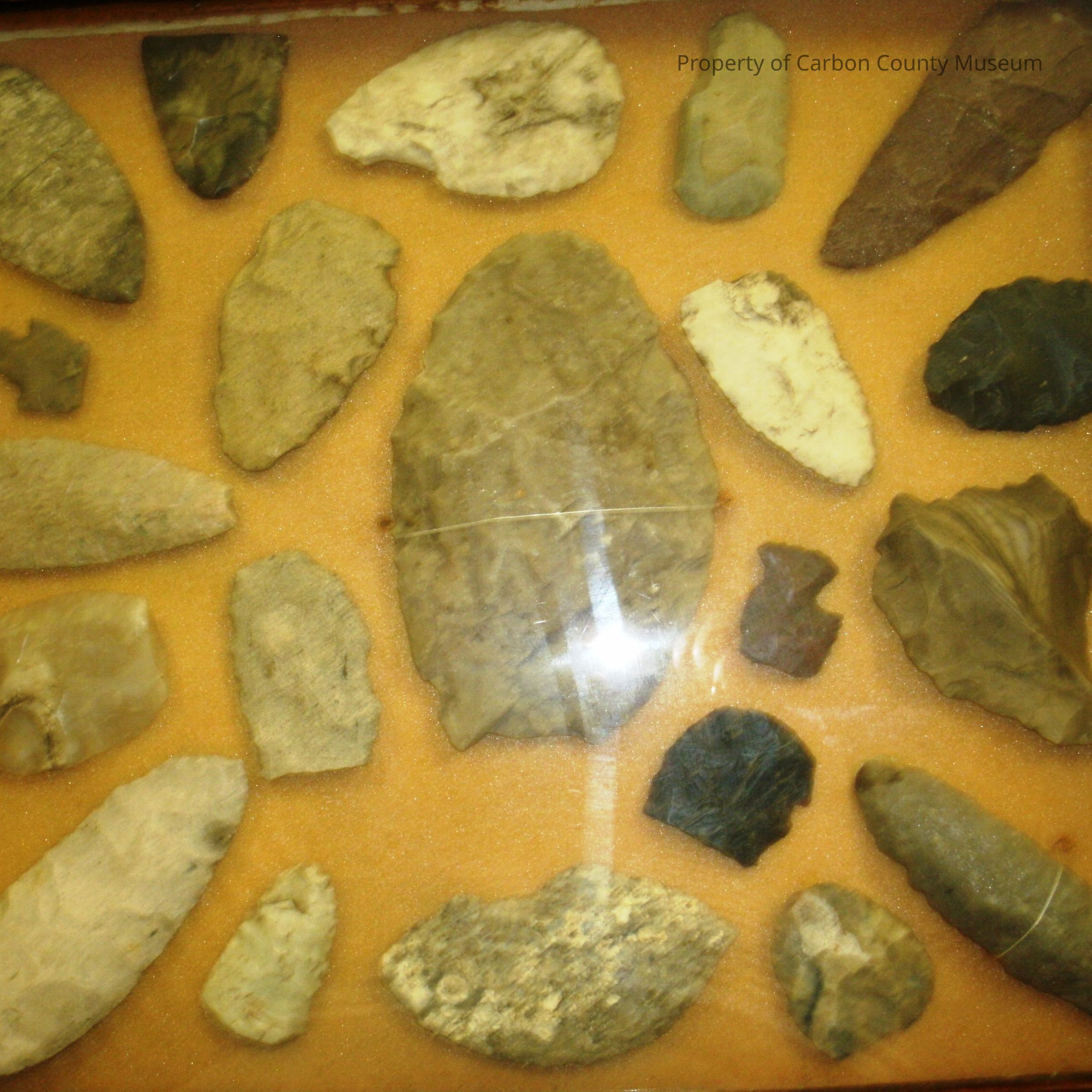 A 13" x 15" frame with glass front of 21 various worked. artifacts including medium arrowheads, small scrapers and other broken pieces with a large scraper at center, which is wired in position as is stone at lower corner right. Design is an irregular circular pattern. Frame is of narrow dark wood molding , shadow box style. Arrows and artifacts are mounted on yellow foam. Two points have been repaired with glue. Frame is backed with two pieces of masonite. Good condition, but frame has green residue on lower edge. Written on back in pencil: Found by Robert Gates, Craig, Co. between1920 -1930 at Fortification Rocks-North of Craig, Co. Mounted and framed by George Gates, Craig, Co. Given to Marion 2/1985.Collection