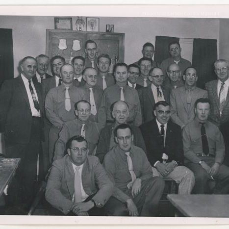Update July 2011: Black & white print of five irregular rows of men. They are dressed in slacks, shirts & ties with some wearing suit jackets. A case is behind them with plaques, trophys & photographs inside. A window is on each side of the case. Some men are seated on chairs, two are kneeling in front & most are standing. Tables or desks are beside & in front of them.