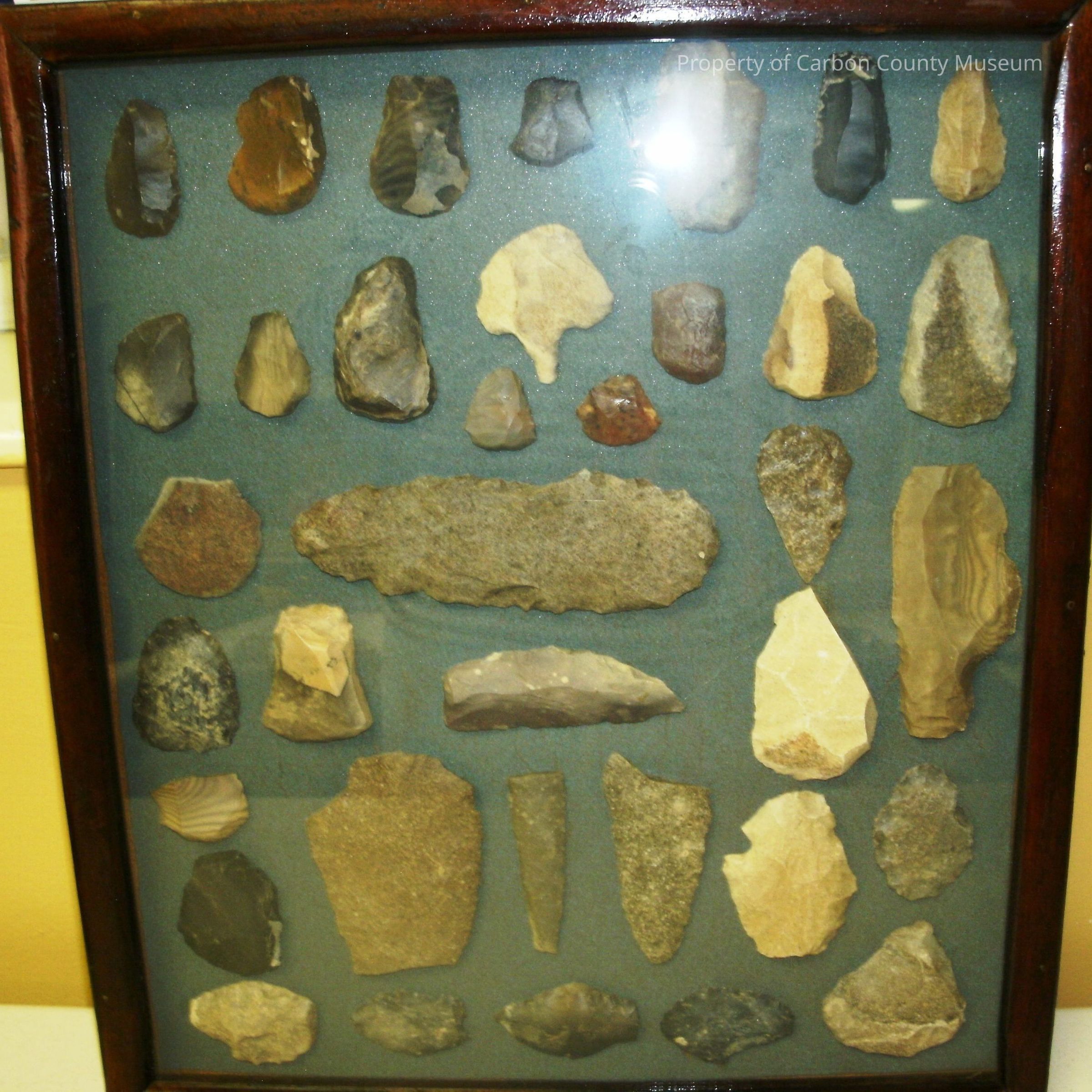 A 13" x 15" frame with glass front of 37 (approximately) pieces of tiny to large scrapers, few broken points, unknown stone remnants. Narrow dark wood frame molding , shadow box style. Scrapers and artifacts are mounted on green foam. Frame is backed with a piece of masonite. Written on back: Found by George Gates, Craig, Co. 1961-1978, Red Desert, WY and Moffat Co., Good condition with some scratches.Collection