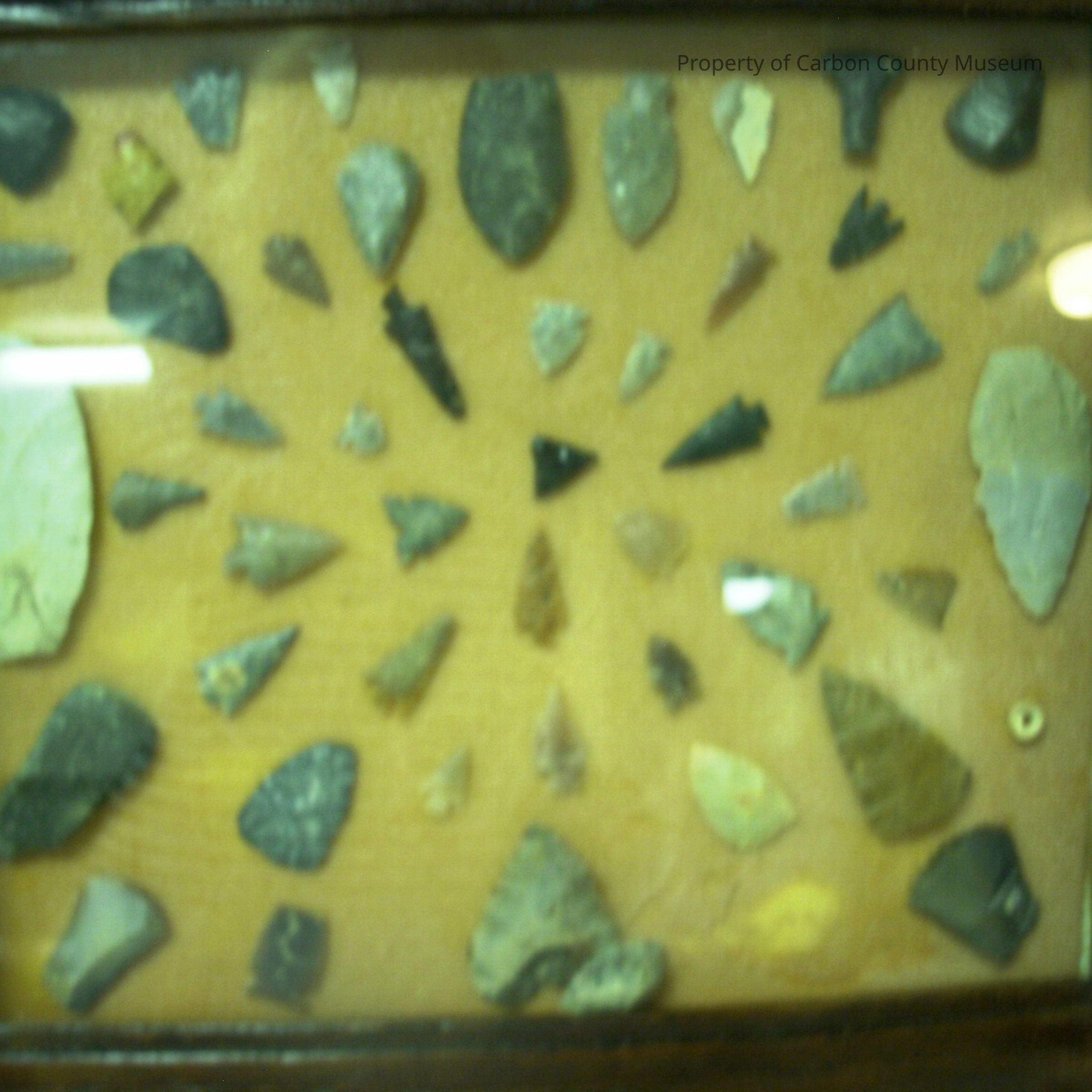A 12 1/4" x 14 1/4" frame with glass front of tiny arrowheads with few medium scrapers and other worked pieces and one bone bead. A medium size brown wood molding frame, shadow box style with masonite back. Artifacts are in a slight starburst design mounted on orange/tan foam Good condition with few scratches, and some green residue on side of frame, along with 1 loose artifact inside frame. Written on back: found by George Gates, Craig, CO. 1960-1978, Red Desert, WY and Sand Wash, CO.Collection