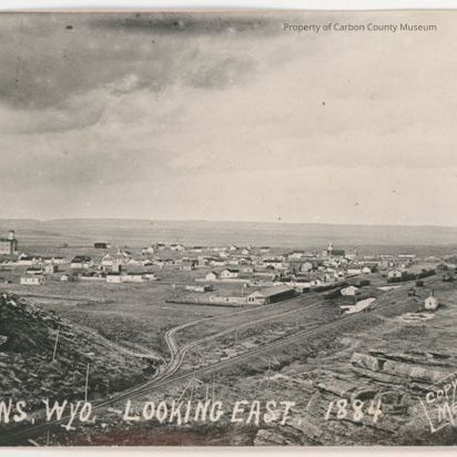 Update - 2009: Black & white copy postcard of birds eye view of Rawlins in 1884. Railroad tracks coming between rocky hills in photo left. Old court house in distance. Hotel on south side of tracks. Church steeple in center distance. Houses are scattered with bare ground between. Printed in white on original negative "Rawlins, WYO - LOOKING EAST 1884" " Copy by Meyers"